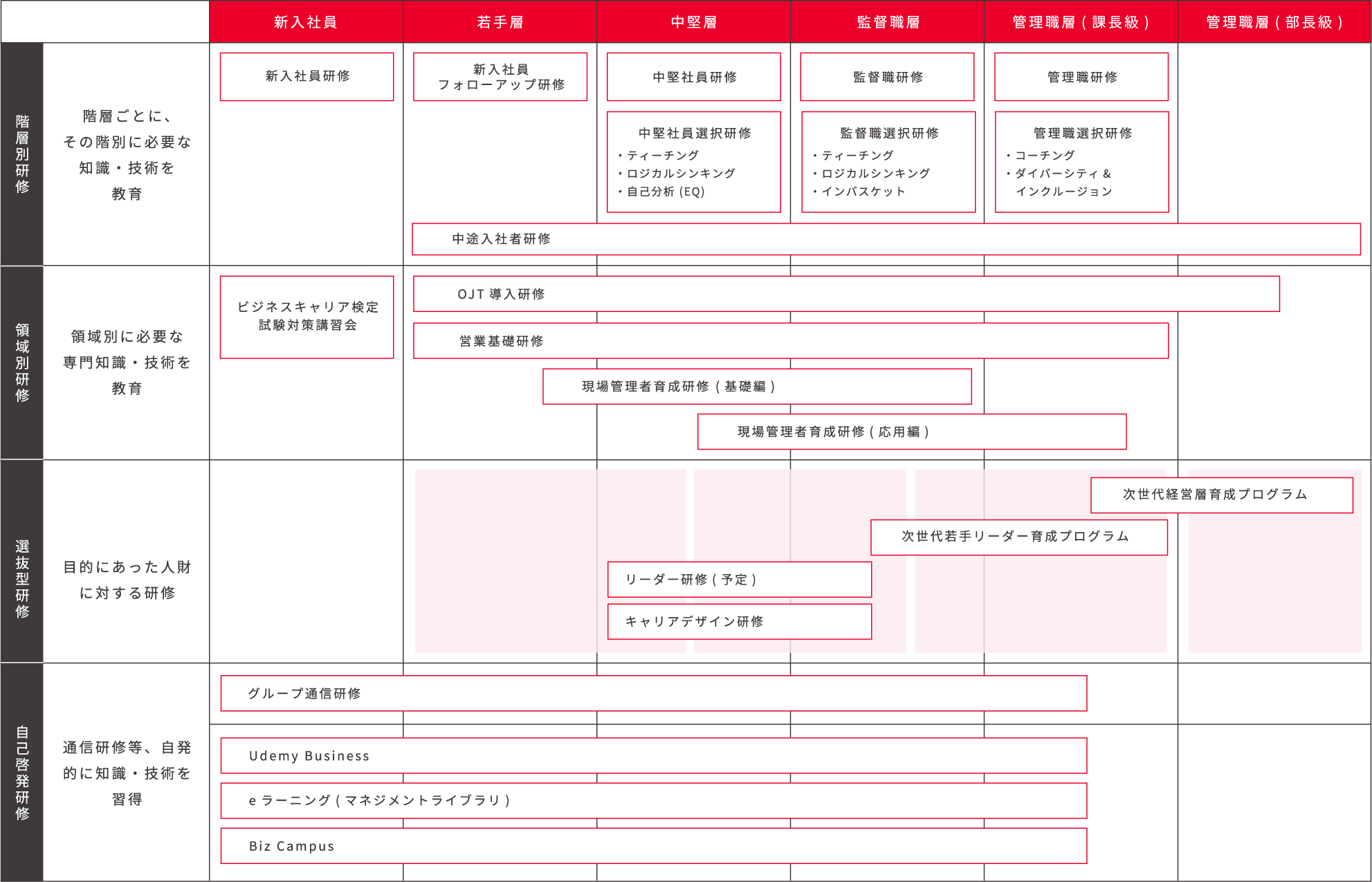 当社の研修プログラムは、階層別研修、領域別研修、選抜型研修から構成されており、それぞれ、役職、職種に応じたきめ細かいプログラムを設けています。